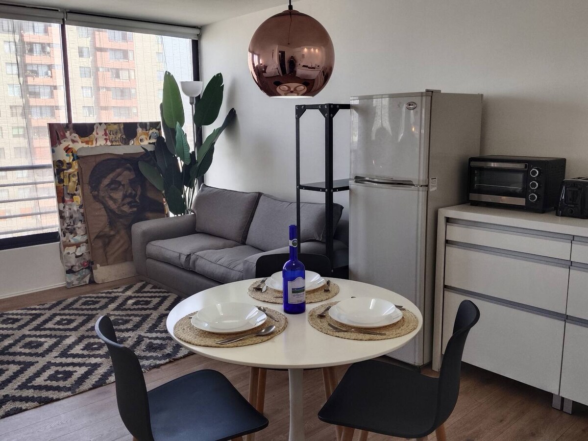 Estudi modern a Santiago Centro, a 2 minuts del metro de Santa Ana. Llit doble, televisor, wifi, tovalloles, bany privat. Cuina equipada amb forn, microones, bullidor, espremedor, olles, vaixella, gots, sal, sucre i oli. També inclou una planxa, una taula de planxar i un assecador. Edifici amb piscina, gimnàs, espai de cotreball (amb avís previ) i bugaderia (de pagament). A prop de la plaça d'armes, Movistar Arena, Fantasilandia i més. Ideal per conèixer Santiago! Esperem veure't aviat!