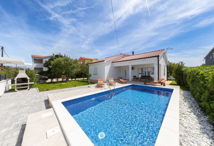 aquesta vil·la nova està situada en una ubicació única al costat de la platja. La vil·la té una vista preciosa del mar i la posta de sol et deixarà sense alè. La casa consta de quatre dormitoris , sala d'estar amb menjador, cuina totalment equipada, tres banys, dos lavabos per a convidats, una terrassa i un pati. Dos dormitoris tenen el seu propi bany. Tots els dormitoris tenen aire condicionat i TV. La piscina està climatitzada i té una part poc profunda per als nens. A la terrassa hi ha un jacuzzi.