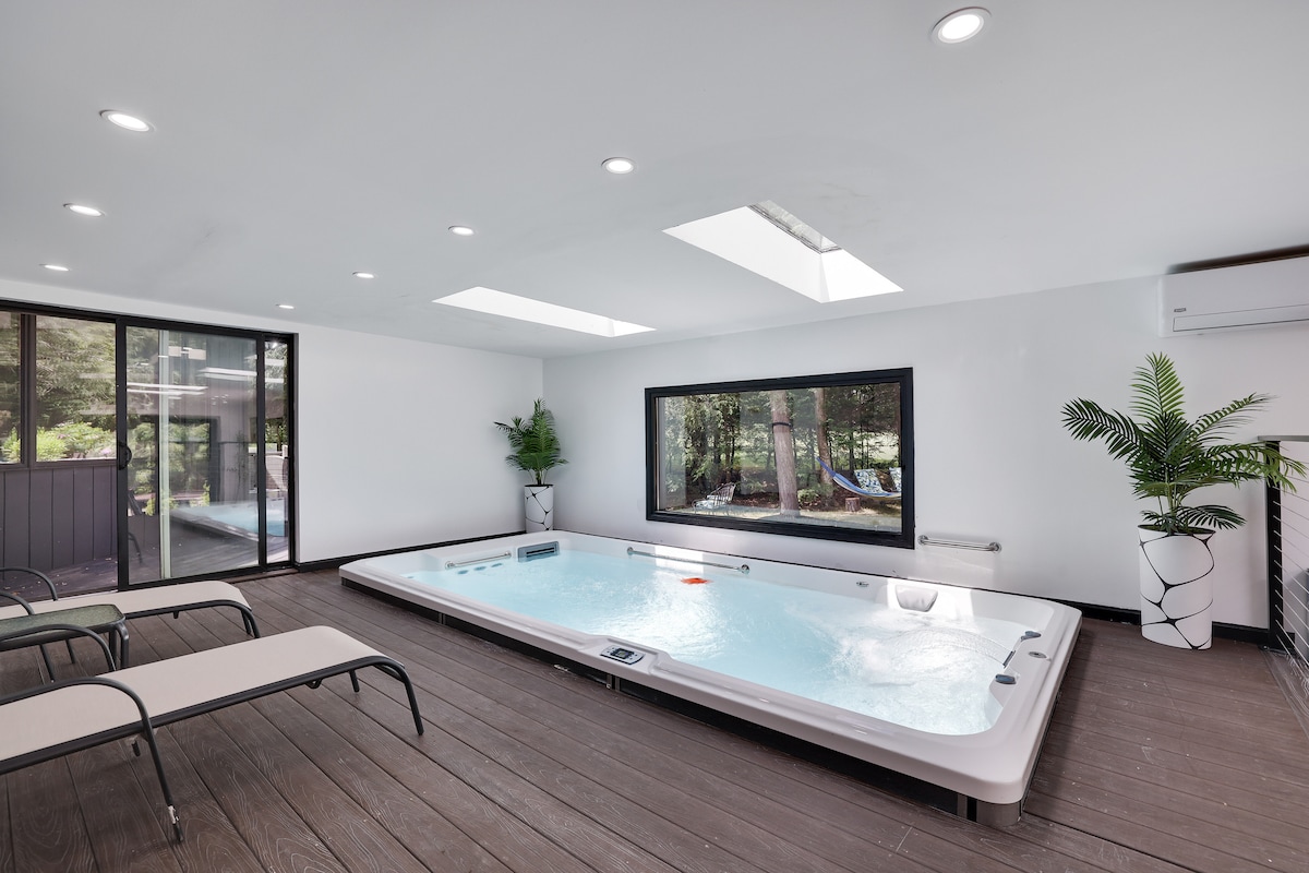 Latitude Adjustment és un refugi únic al llac Pocono, dissenyat per a aquells que busquen la barreja perfecta de relax i exploració local. Equipat amb una increïble sauna de vapor a l'aire lliure per a 4 persones, una banyera d'hidromassatge privada per a 7 persones amb cascada, altaveus Bluetooth i llums LED, una enorme sala de jocs amb televisor de 65 polzades, estufa de llenya, gran zona d'entreteniment a l'aire lliure amb graella, brasa, cobert per a convidats i menjador. Situat en una bonica comunitat de Arrowhead Lake, rica en serveis, a 1 minut a peu del llac.