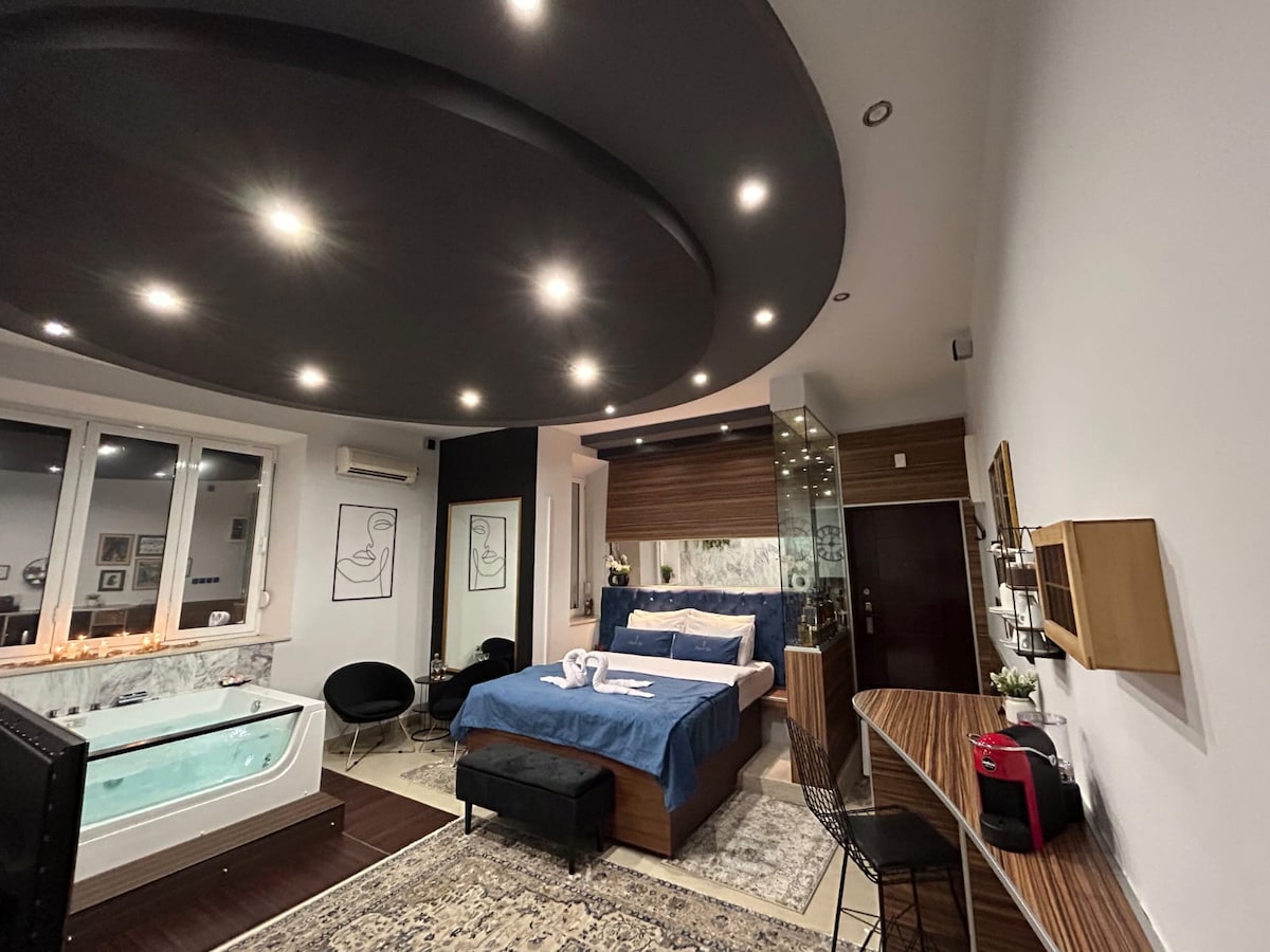 Et donem la benvinguda al nostre luxós apartament d'un dormitori amb spa, que ofereix una escapada tranquil·la de l'enrenou de cada dia. Allotjament: Amb un dormitori elegant, una sala d'estar còmoda i un bany modern, el nostre apartament també inclou una zona d'spa privada amb banyera d'hidromassatge i sauna.