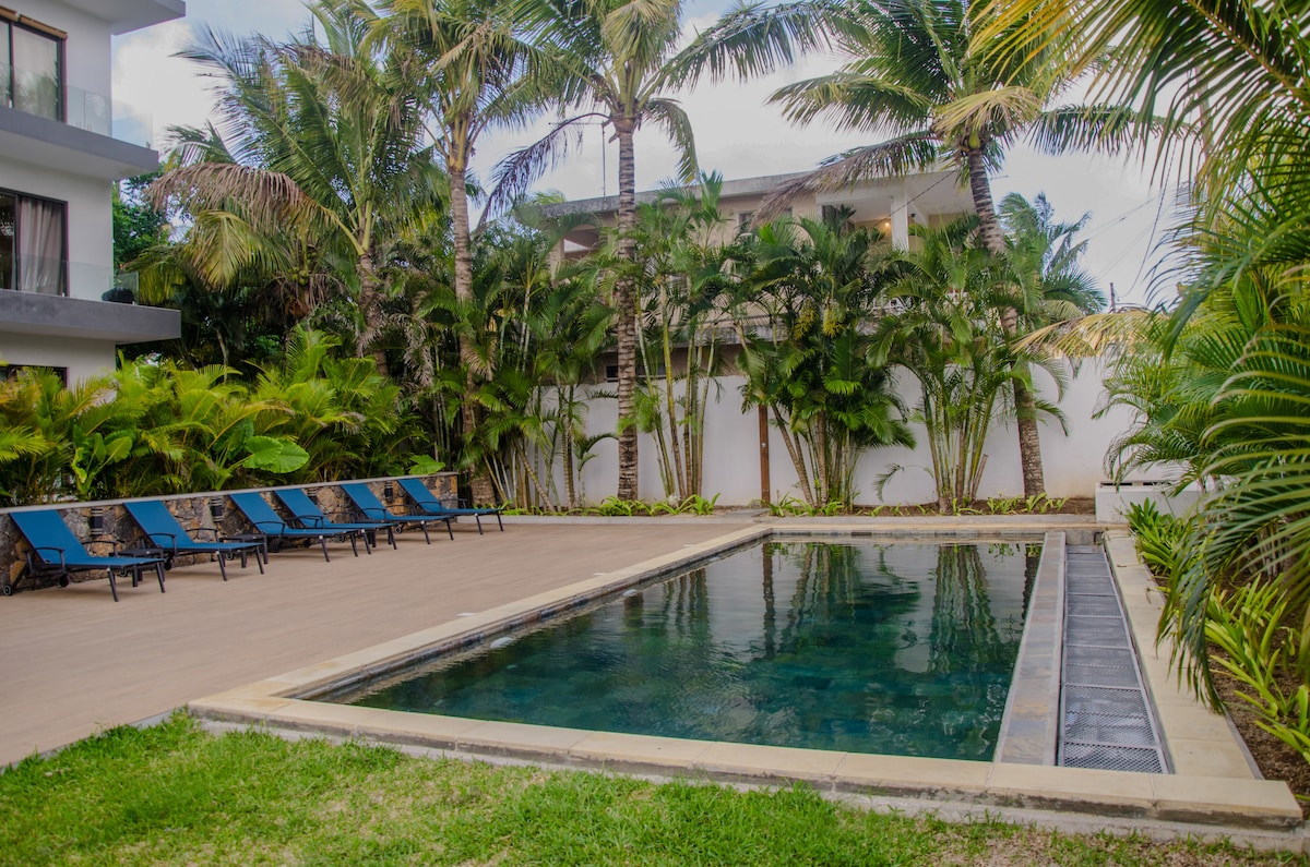 Your 1st floor apartment in a new, small guest house. You will enjoy privacy and 2 Bedrooms, 2 Bathrooms, lounge, 2 kitchens and private patio. The property has heated roof top swimming pool, gym and picnic table. Located close to private beaches and boutique hotels. Your have a large private BBQ terrace, outside seating, and access to bar and others areas. Local restaurants and hotels are a short walk. AC in all rooms. Point aux Canionniers is between Mont Choisy Beach and Grand Baie.