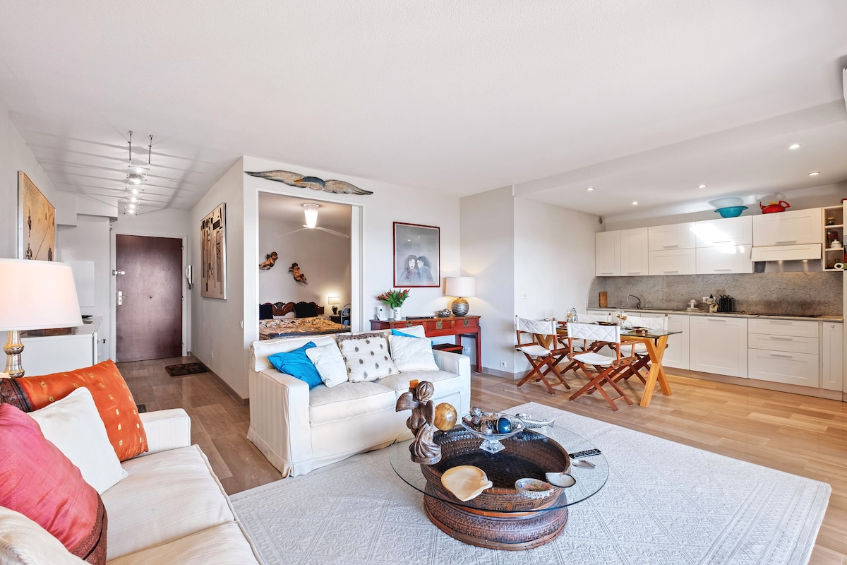 Aquest apartament excepcional es troba a la 4a planta d'un edifici d'apartaments a la Promenade des Anglais, és a dir, a pocs passos de la platja. L'apartament té una gran sala d'estar/menjador amb cuina oberta, així com 2 dormitoris, 2 banys i una gran terrassa. El mobiliari és elegant. L'espaiós balcó està davant del mar i té sol (gairebé) tot el dia. El centre de la ciutat està a 15 minuts a peu o 5 minuts amb tramvia.