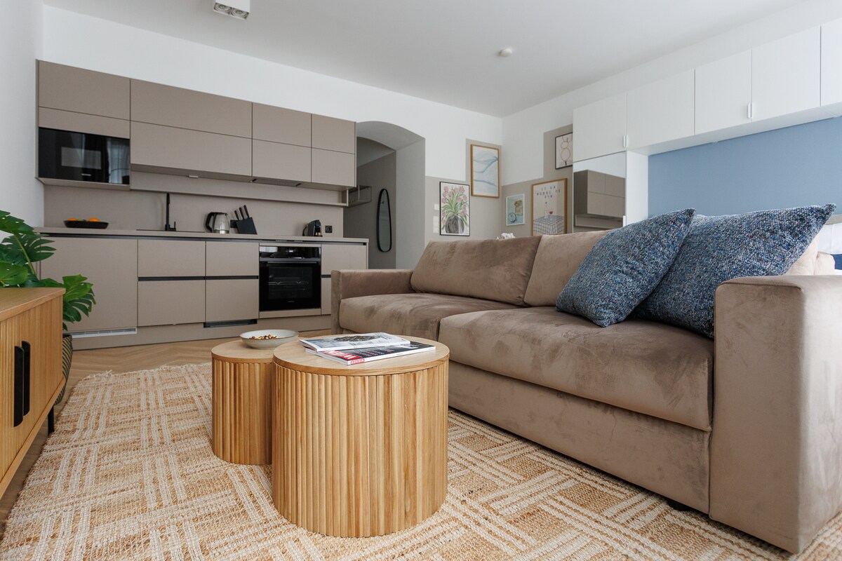 Apartament elegant recentment renovat situat al districte francès de Viena, molt cèntric, a 2 minuts a peu del transport públic i a 7 minuts en cotxe del centre de la ciutat. El pis de 2 habitacions és acollidor i tranquil, adequat per a turistes o viatgers de negocis. Disposa d'un dormitori independent amb llit de matrimoni, gran armari integrat i sala d'estar amb un còmode sofà llit. La cuina està ben equipada amb màquines Siemens, com bullidor, Nespresso i altres màquines. El bany de luxe és molt espaiós i té una banyera de disseny.