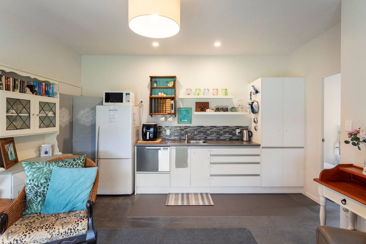A minuts de la ciutat; a quilòmetres de qualsevol lloc! Un refugi tranquil a la vora de l'aigua amb accés privat. Dormitori amb llit de matrimoni; saló amb un còmode sofà llit de matrimoni; cuina americana/bugaderia; bany; vàter separat. La sala d'estar es pot utilitzar com a oficina (wifi ràpid, televisor i taula petita). Si necessites més espai, consulta l'altre anunci: «Pis a la vora de l'aigua - Kotare (amb cuina completa)». Per a un grup més gran, consulta també l'anunci "The Works": la porta de connexió entre les unitats s'obre per dormir fins a 7 persones.