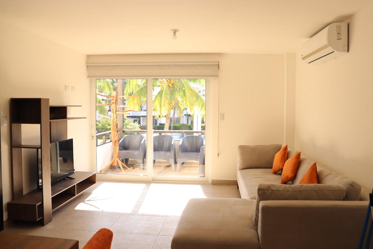 Linda Villa en alquiler. Se encuentra en el primer nivel y cuenta con piscina privada, es de fácil acceso para personas mayores e ideal para familias. El complejo cuenta con una de las piscinas con río más grandes del país. En la villa caben 6 personas cómodamente, sin embargo, de ser necesario hay 3 camas adicionales imperiales abajo de todas las camas.