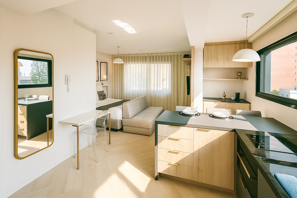 ✨ Tindràs la comoditat de la planta 16 en aquest loft amb Alexa Automation, SmartTV, llar de foc elèctrica, Ar-Split i cuina equipada, dutxa de gas, llit Simmons (el més còmode del món) i punts de garatge gratuïts inclosos. Aquí tens: • Terrat amb vista panoràmica • Barbacoes • Piscina de 25m • Academia • Espai de cotreball • Entrada 24h • Bugaderia • Ascensor, Garatge Proximitats: • Botigues de queviures • Aeroport a ⟶ 25 min (en cotxe) • PUC⟶ 4 min (a peu) • Centre, Consolat⟶ 15 min (cotxe)