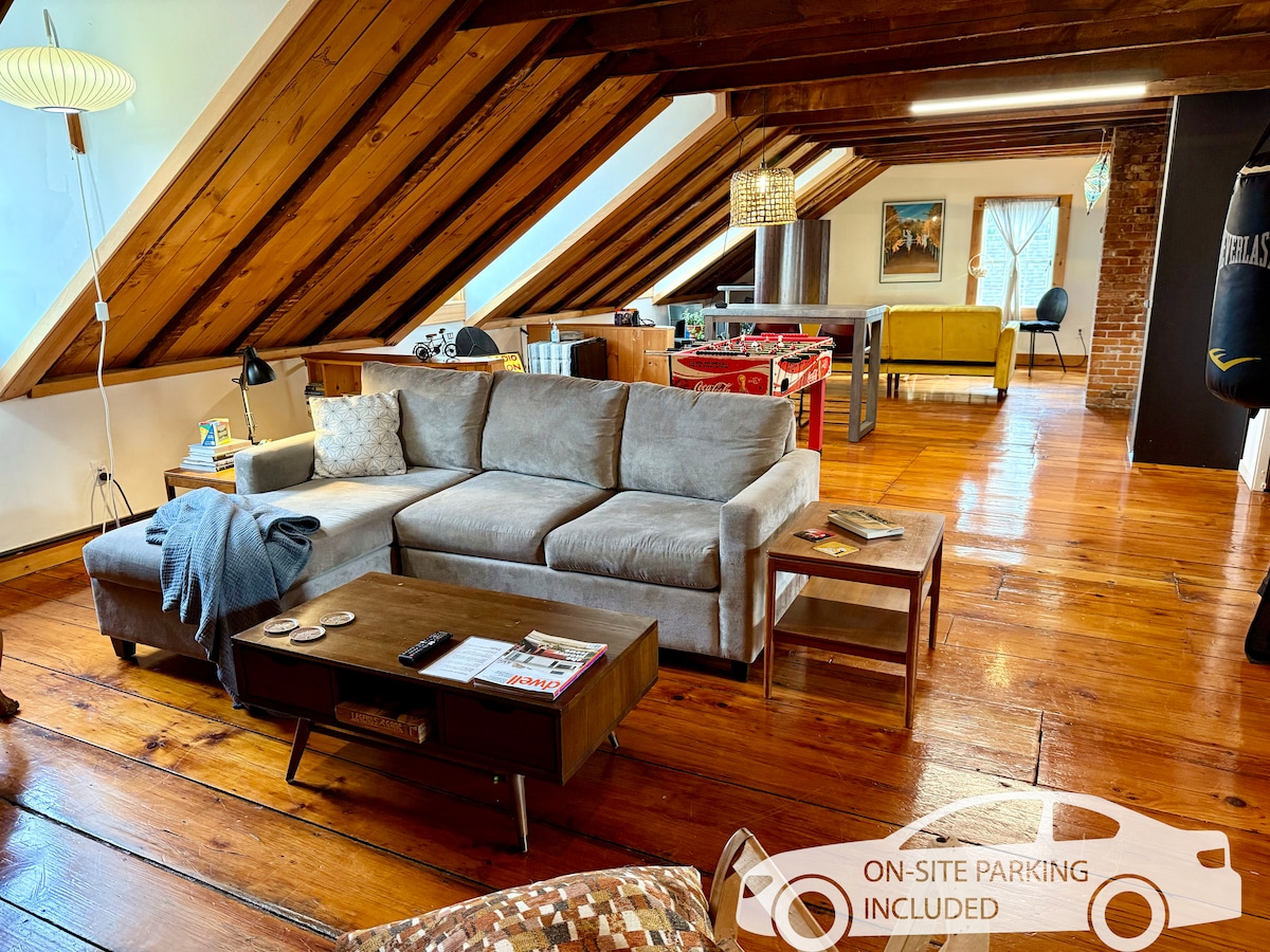 Apartament modern de 2 nivells en una casa adossada del segle XIX al Registre nacional del districte històric de Portsmouth. Els hostes poden fer un ús exclusiu de tot l'apartament durant l'estada. Ambdós nivells estan oberts a travessar la brisa marina des del port de Portsmouth a poques maneres de distància; el loft del tercer pis té vistes dels ocells de les propietats històriques i el cel obert, i està ple de fustes càlides. El nivell del segon pis inclou una cuina, una sala i un segon bany amb una banyera amb peus de garra, retallada en motllures d'època.