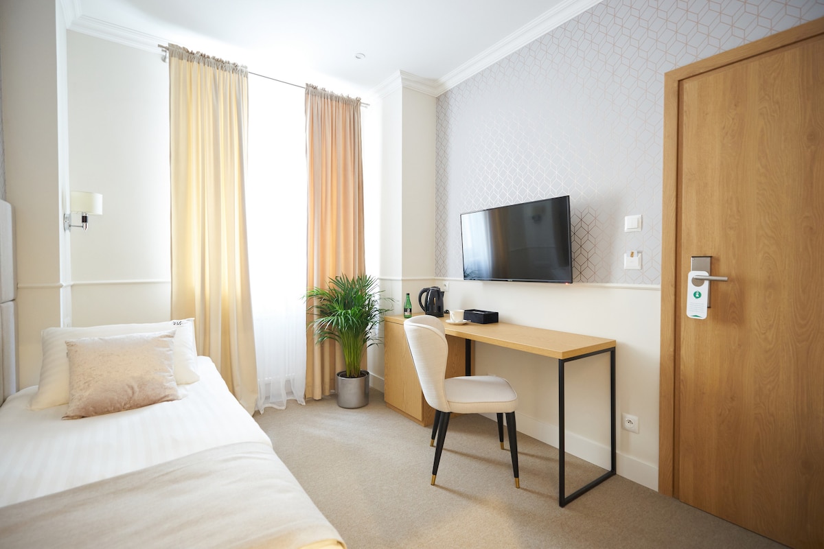 Pokój dwuosobowy typu standard z możliwością wyboru jednego łóżka podwójnego lub dwóch łóżek pojedynczych. W pokoju znajduje się sofa, szafa, stół, krzesła oraz prywatna łazienka.