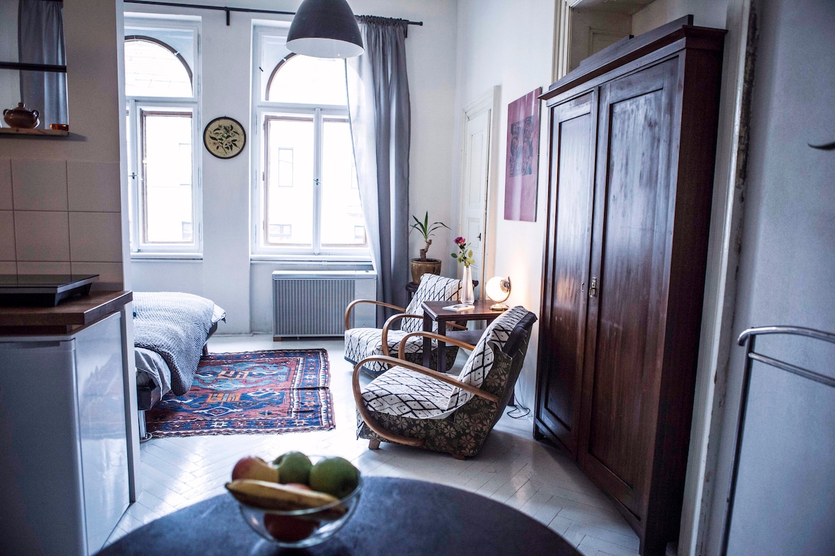 We offer this specious boudoir/studio apartment in the center of Prague. The studio is composed of one separate part with one double bed (180x200), kitchen corner, eating area and comfortable bath room with shower. The toilet is outside over the hall/separate from the apartment/- but not shared! only for our guests, not for anybody else. ).All new and made with personal touch. The apartment is situated on a lively crossroads .