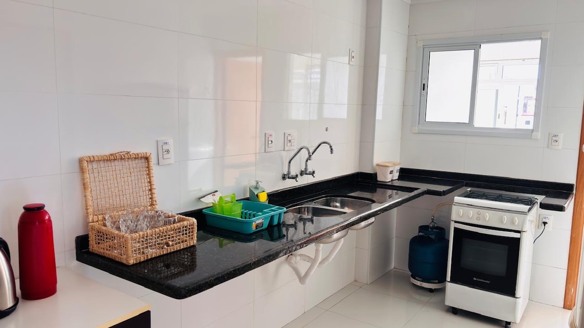Et donem la benvinguda a Mar Tupi Front! Apê peu a la sorra del barri de Tupi, Praia Grande. Té capacitat per a 5 persones amb 1 bany privat (llit doble + individual), sala d'estar amb sofà llit, aire condicionat, wifi, cuina completa, rentadora, barbacoa de carbó (ecològic) al balcó amb vistes laterals al mar i kit de platja. Comoditat i ubicació perfecta per relaxar-se amb el so del mar. *** No ofereix llençols ni llençols.