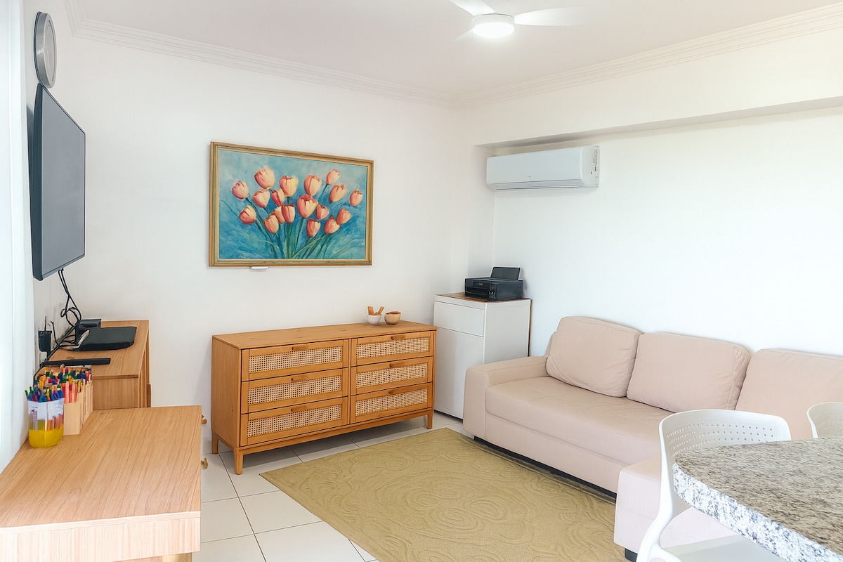 L'ESMORZAR NO ESTÀ INCLÒS! Elegant apartament estudi, perfecte per a la teva estada a Maceió! El nostre 917 té un balcó gourmet amb increïbles vistes al mar, a més de l'edifici està a 50 metres de la platja, una piscina amb un terrat infinit i molts serveis perfectes per a tu. Equipat amb cuina americana equipada, aire condicionat, televisor intel·ligent de 32 polzades, bany privat, taula i planxa, telèfon.