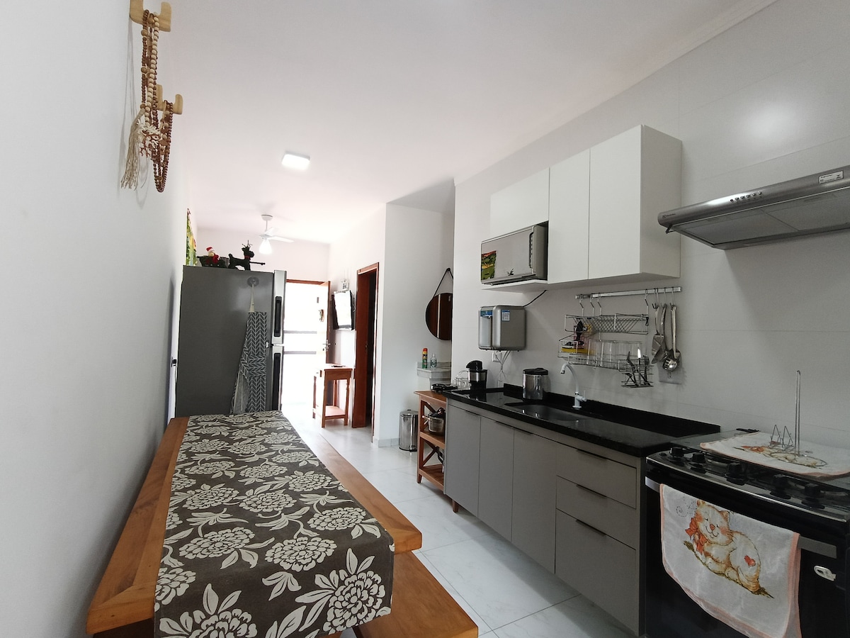 Lindo apto aconchegante de 52m2, distante 500 metros da praia, com 2 dormitórios, sala ampla, ar condicionado, internet com Wi-Fi, cozinha completa, sacada com churrasqueira, 2 vagas de garagem privativas, brinquedoteca e piscina compartilhada entre proprietários e hóspedes. A churrasqueira é privativa e tem um grande diferencial, você poderá fazer seu churrasquinho com vista para as montanhas e aproveitando ao máximo desse momento com a família e amigos.