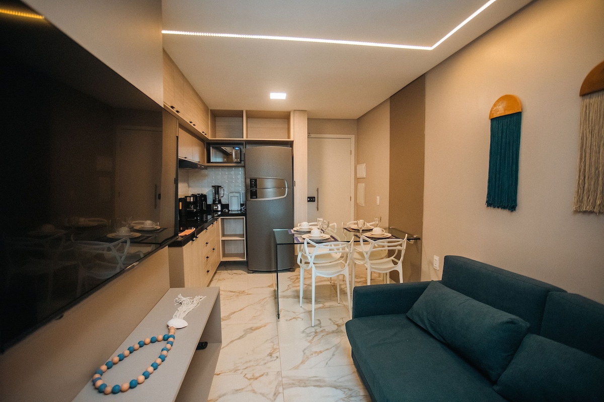 Gaudeix d'Oásis a Porto de Galinhas – Flat na Praia. Un pis modern amb dos dormitoris amb aire condicionat, cuina totalment equipada, wifi, televisors 4K i una decoració elegant. El terrat disposa d'una piscina panoràmica, una zona gourmet, gandules, un saló i accés directe a la platja. Excel·lent ubicació: a 8 minuts a peu del centre de la ciutat i a només 1 minut del mar cristal·lí. Perfecte per relaxar-se amb comoditat i estil.