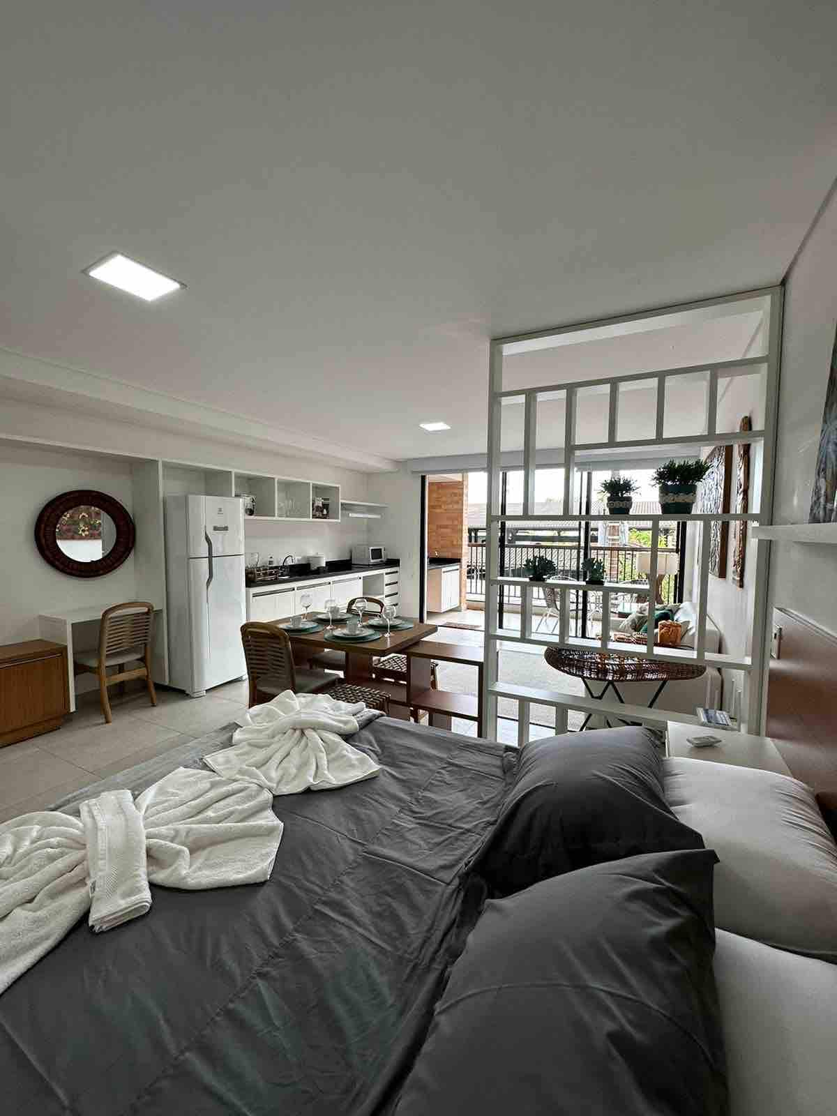 El pis està situat davant de Praia Grande. Disposa d'un balcó amb vistes laterals al mar. Té una suite amb aire i televisor de 43. A la sala d'estar també tenim 43 televisors i un sofà llit que converteix un llit doble i una persiana opaca gira la sala d'estar en un altre dormitori. Internet propi de 100 MB. Gourmet còmode a la graella gurmet. La zona comunitària disposa de piscina climatitzada, sauna seca i de vapor, jacuzzi, cinema i biblioteca de joguines. Nota: la piscina climatitzada i el jacuzzi estan tancats per manteniment.