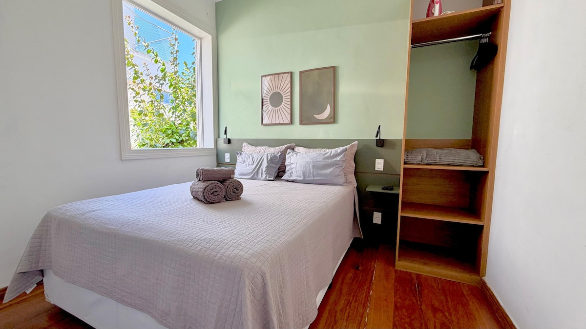 Estudi amb accés independent i privat, al cor d'Ipanema, al carrer residencial i silenciós, edifici antic i bucòlic, amb molta vegetació al voltant. L'estudi consta d'un llit doble, bany privat complet amb dutxa d'hidromassatge, minibar, aparador amb calaixos i aire condicionat. És a la tercera planta, sense ascensor. L'edifici està a 1 bloc de la llacuna i a 8 minuts a peu de la platja d'Ipanema, amb abundant comerç al voltant i moltes opcions gastronòmiques com bars, restaurants, mercats, etc.