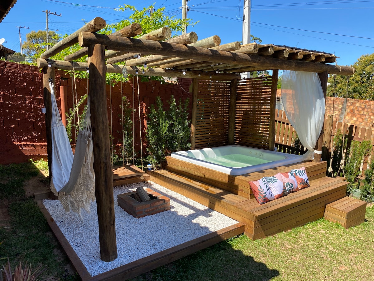 Una "Casa Sonho do Rosa" Fica a 1,4 km de centrinho do Rosa i a menys d'1 km de Mar del Rosa. Estem sols en un terreny de 450 m2, tot privat per a tu i el teu grup. Jacuzzi climatitzat per a un màxim de 8 persones. Quadra de Areia il·luminada. Piscina amb hidromassatge, cascada i LED. Pergolat a la gespa amb columpi, llar de foc de brutícia. Coberta amb pèrgola coberta i barbacoa. Hi ha 2 dormitoris: A la primera tenim un llit Queem. En el segon tenim un llit doble + llit doble. Hi ha 2 hostes addicionals a la sala d'estar.