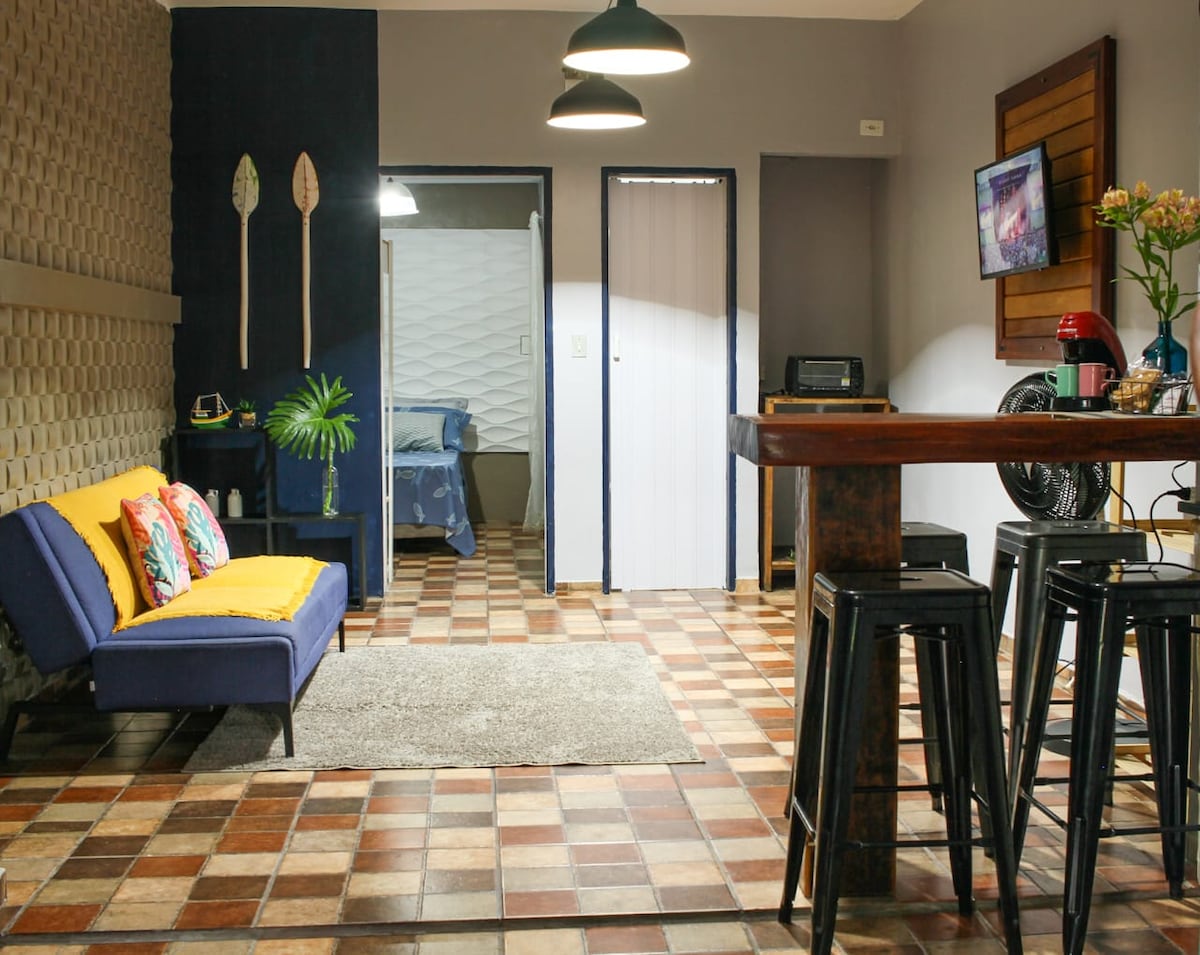 ESTÚDIOS ITAPYTANGA: una experiència diferent a la costa nord de São Paulo! Studio Azul Estudi encantador situat en una de les zones amb més belles vistes d'Ubatuba, amb vistes al mar de Praia Vermelha do Centro. A 500 m de Praia Vermelha, l'espai té capacitat per a 4 persones: llit de mida queen, sofà llit doble, cuina equipada, forn de microones, ventiladors de sostre, wifi, televisor de fibra òptica amb més de 70 canals i un balcó meravellós on, relaxat en una de les xarxes, contemplaràs el bosc i el mar.