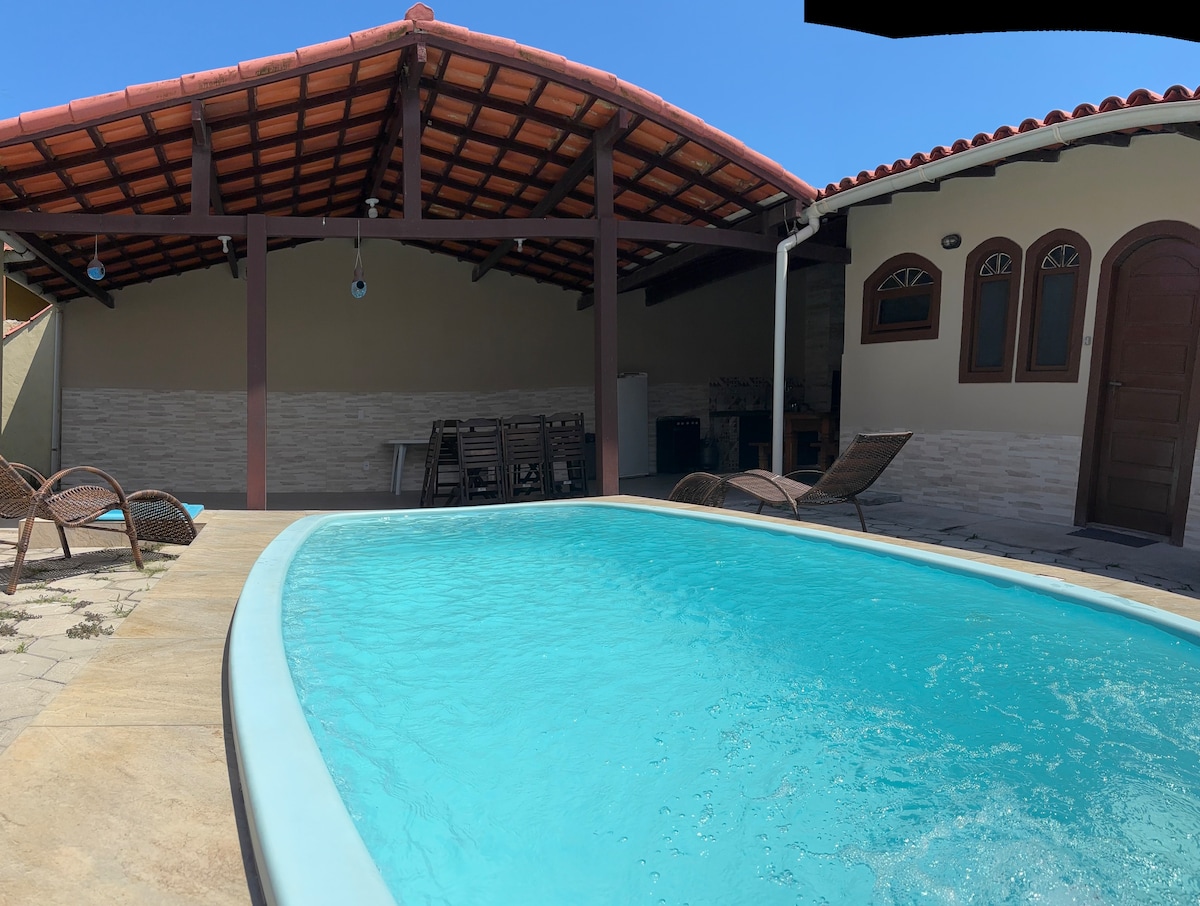 Un lloc deliciós i espaiós amb poc moviment i que irradia tranquil·litat és el que trobaràs en aquesta casa encantadora. Té una extensa gespa amb molts detalls a cada cantonada: pèrgola, font, vermell, gronxador, piscina, hort (PRIVAT). Situat a Condomínio Orla 500, a prop de Buzios, Cabo Frio i Rio das Ostras. A 800 metres de la platja Wifi per a l'oficina a casa, Netflix, barbacoa de carbó portàtil. Nota: no permetem que els hostes rebin visites durant el dia, etc.