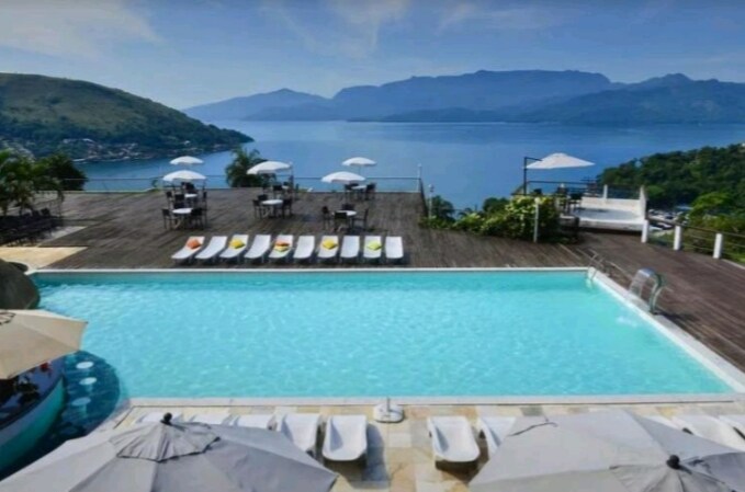 Flat Suite/Hotel Portogalo. Espaiós amb balcó, vistes cinematogràfiques de la badia d'Ilha Grande, lloc paradisíac: platja privada amb accés en telefèric i cotxe, coberta per a vaixells, bar i restaurant de platja, cascada i tota l'estructura d'oci de l'hotel, piscina, jacuzzi, jocs, bufet i restaurant a la carta, servei d'habitacions, bars, pizzeria, wifi. Capacitat per a 5 persones, 1 llit «king size», 1 llit individual i 2 llits inflables. Microones, minibar, coberts, coberts, gots, plats i estris.