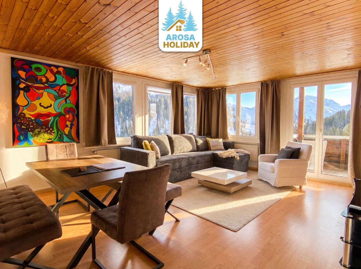 Bright 2-room apartment located on the 3rd floor of a residential building in a quiet area in the center of Arosa. Enjoy the spectacular mountain view from the balcony and rooms, which is one of the best views in Arosa. The bus stop and supermarkets on the main road are very close to the apartment.