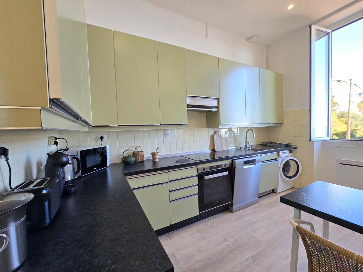 Aquest apartament excepcional es troba a la 4a planta d'un edifici d'apartaments a la Promenade des Anglais, és a dir, a pocs passos de la platja. L'apartament té una gran sala d'estar/menjador amb cuina oberta, així com 2 dormitoris, 2 banys i una gran terrassa. El mobiliari és elegant. L'espaiós balcó està davant del mar i té sol (gairebé) tot el dia. El centre de la ciutat està a 15 minuts a peu o 5 minuts amb tramvia.