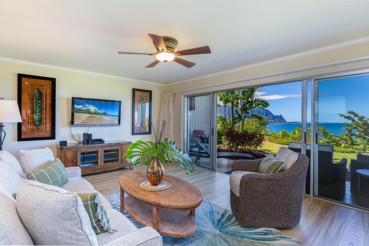 Aquest refugi de platja modern i acabat de renovar ofereix una vista panoràmica de l'oceà i la costa impressionants. Relaxa't al sofà llit mentre observes les magnífiques vistes des de l'escull Anini fins al far de Kilauea. Alguns han dit "és com estar en un vaixell al mar" mentre veuen balenes trencant-se a l'oceà i les onades escrostonant-se a l'escull des d'aquesta ubicació màgica. Un àtic amb sostres alts i vistes des de totes les habitacions, fins i tot el famós Bali Hai des de la terrassa. És el somni d'una parella!