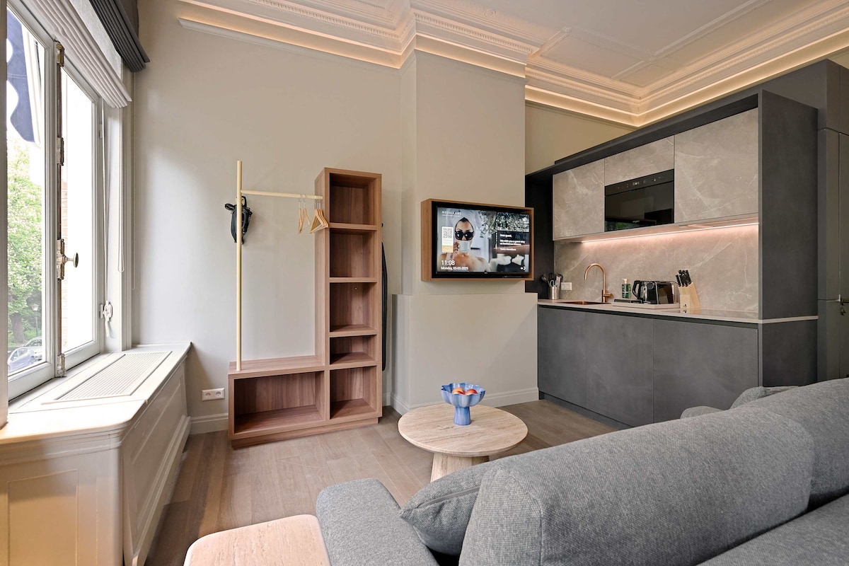 Estudi elegant amb entrada pròpia en una de les zones més populars de La Haia, a pocs minuts a peu de tots els llocs d'interès: palaus, museus, cases del Parlament (Binnenhof), Palau de la Pau, jardí del Palau, botigues, cafeteries, restaurants. A només 15 minuts de la platja de Scheveningen, ja que el tramvia para a prop. El petit estudi (24 m2) està situat a la planta baixa amb wifi, televisor intel·ligent, llit còmode, bany privat i cuina amb tots els subministraments bàsics de cuina.