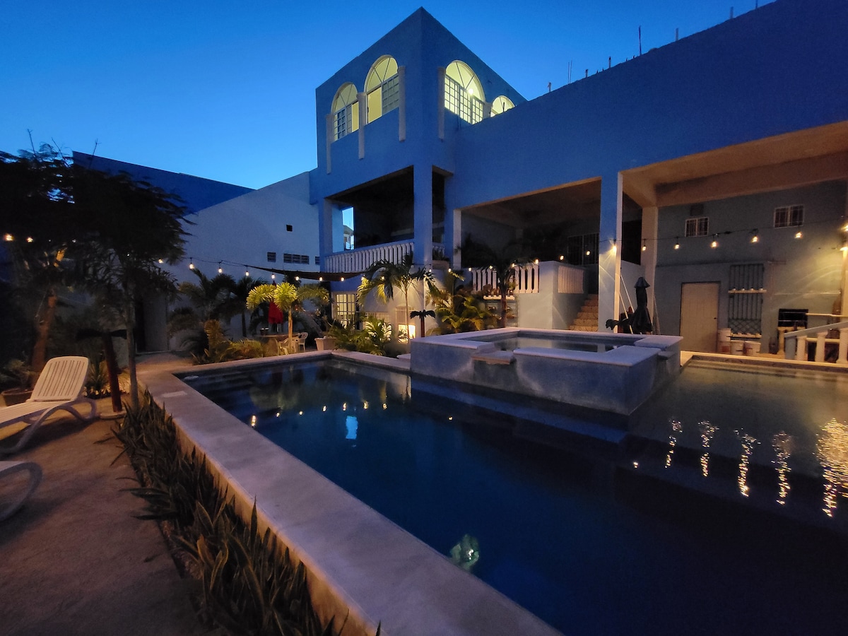Fantàstica casa amb una piscina que es troba a 3 blocs de la platja de Playón i del passeig marítim del Malecón. És una casa de platja tradicional de Progreso amb terres originals i sostres alts, per la qual cosa és fresca i tranquil·la. Hi ha aire condicionat, wifi, aigua calenta, cuina equipada, oficina/zona de treball i televisor. Hi ha una gran piscina, un bar i una zona de gespa que es comparteixen amb els hostes que s'allotgen a la planta superior. La casa està a 10 minuts a peu del centre de Progreso i a 3 minuts amb cotxe. Som aptes per a animals de companyia i famílies!