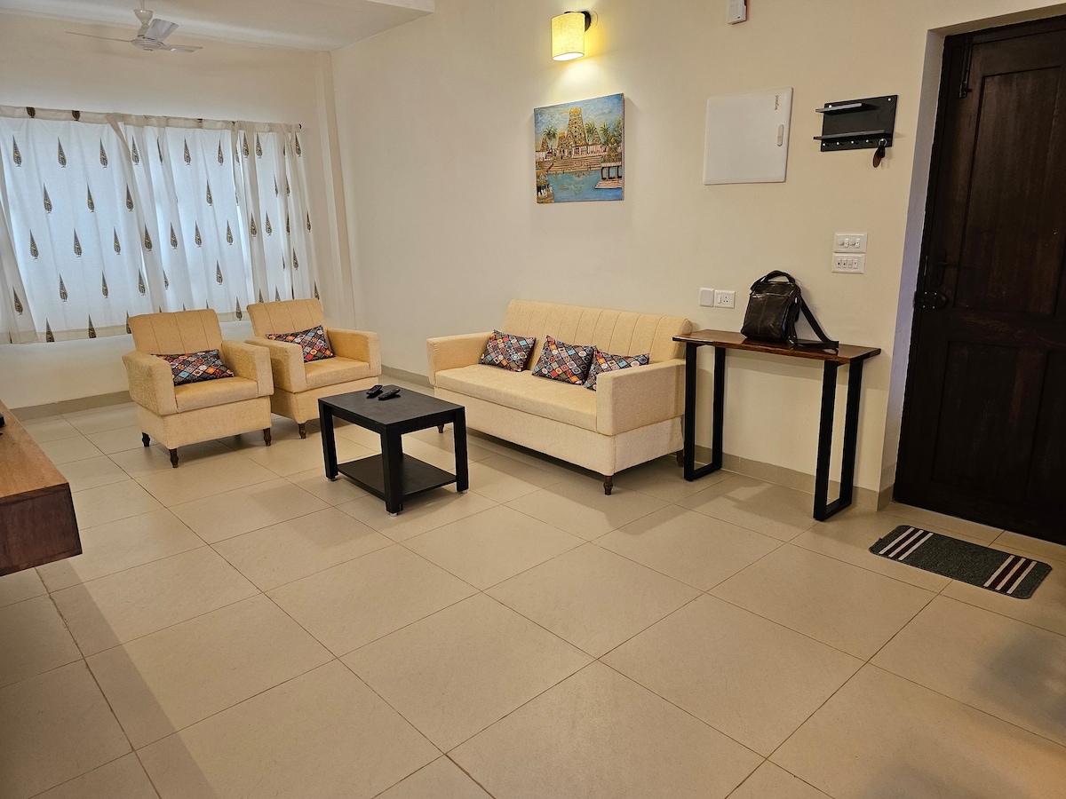 Situat a la tranquil·la ciutat de Pondicherry, el nostre apartament és una escapada ideal del bullici de la vida urbana. Està situat al centre, amb la platja del passeig marítim a només 15 minuts a peu. El nostre allotjament té una vista panoràmica al mar des de la sala d'estar i el dormitori principal. Hi ha 2 habitacions, juntament amb una sala d'estar totalment arreglada, menjador i cuina. Hi ha una còpia de seguretat elèctrica bàsica i internet. Tingues en compte que no es troba a la ciutat blanca, sinó a 1,5 km de la ciutat blanca.