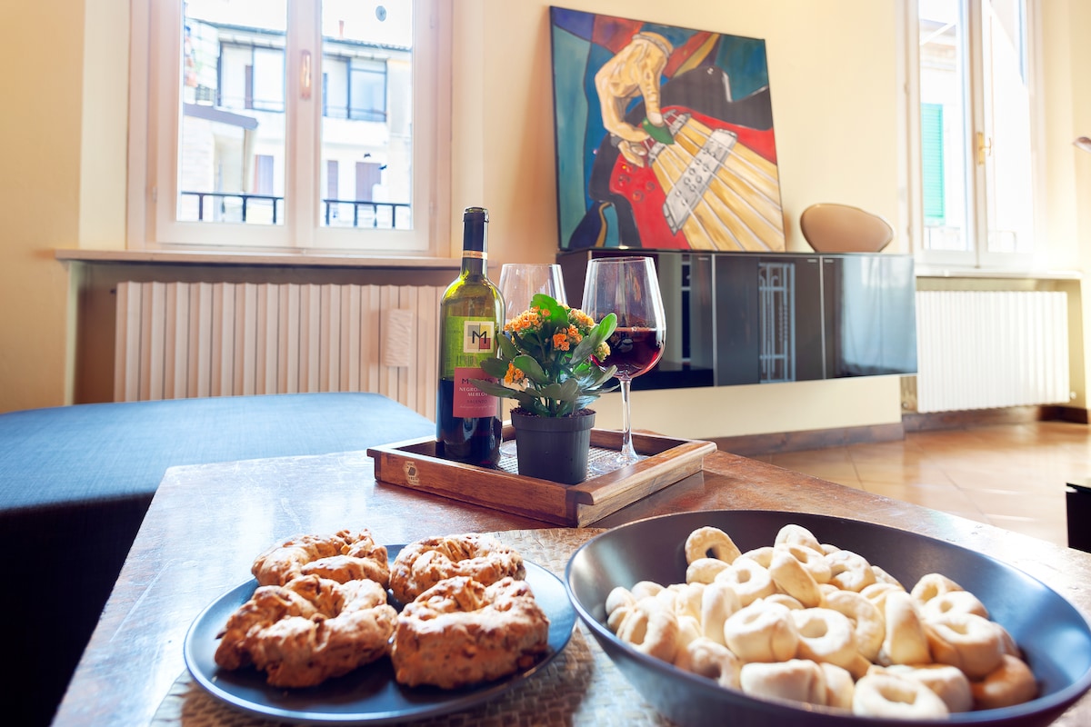 Gaudeix d'una estada en aquesta casa històrica al cor de l'antic gueto jueu de Ferrara amb unes vistes impressionants del perfil medieval de la ciutat i a un pas tant de la catedral com de restaurants amb estrelles Michelin. Un pis a la planta superior, que compta amb un dormitori principal molt gran, un llit «king size» i una sala d'estar independent. També inclou una nova televisió intel·ligent, una sala d'estar, una cuina totalment equipada i un bany modern. El pis està situat a la tercera planta. Tingues en compte que no hi ha ascensor. Bicicletes incloses!