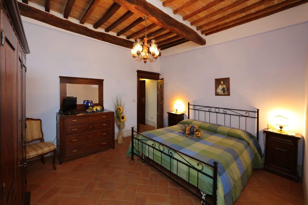 La camera si trova al secondo piano della Locanda nel Cassero. L'atmosfera è quella di una tipica casa Toscana con l'originale soffitto a travi e mattoni. L'arredamento semplice dai toni pastello è in sintonia con l'ambiente.