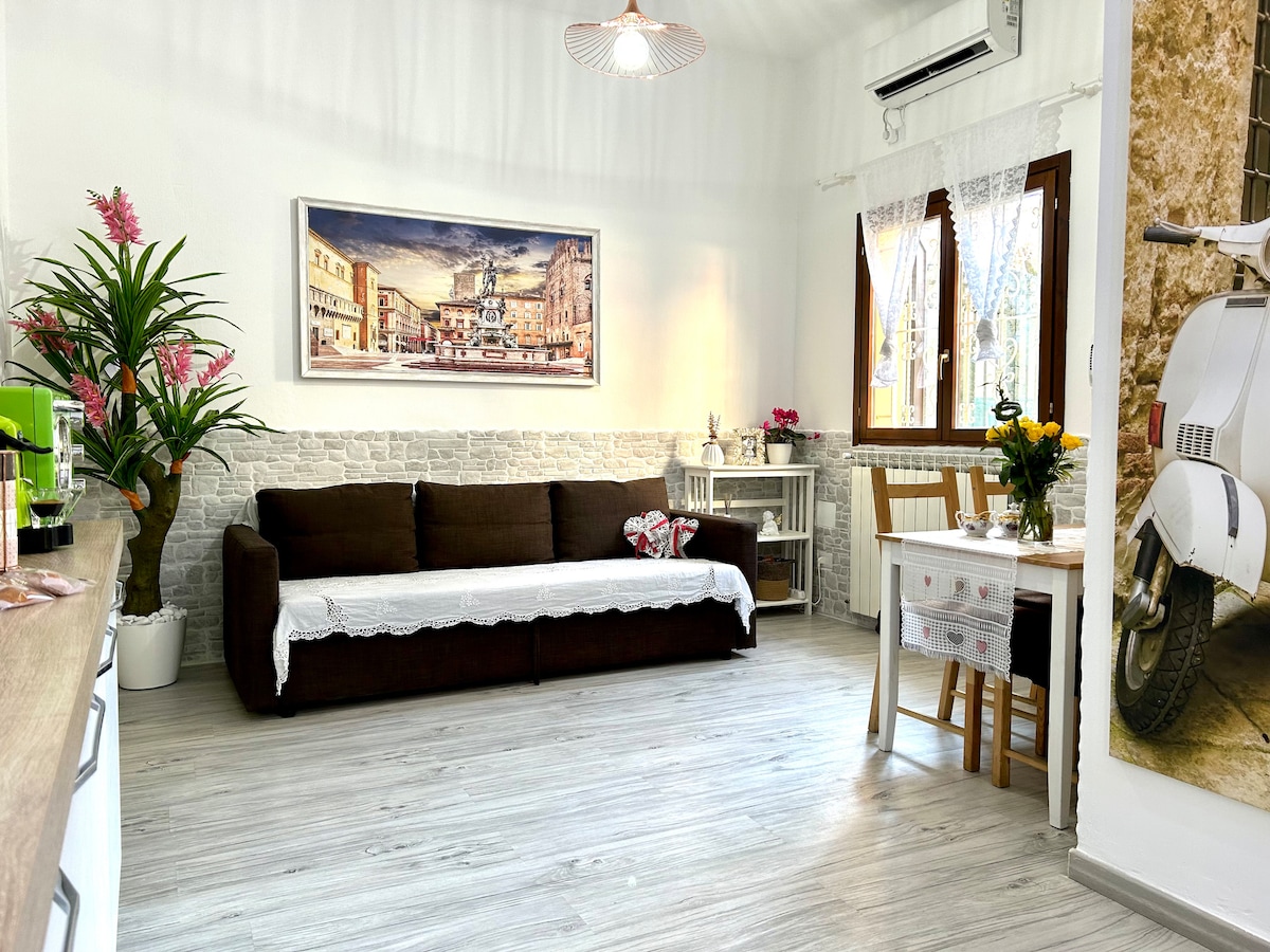 Pis còmode i tranquil al primer pis, en un palau històric situat al cor de la ciutat. Finesament moblat , consta d'un dormitori doble, saló amb sofà llit doble, cuina oberta equipada, bany. Tant des de la sala d'estar com des del dormitori es pot accedir a una terrassa privada, tranquil·la i privada. Està situat a pocs passos del Due Torri di Bologna, a l'àrea de la Universitat. El pis està a 15 minuts a peu de l'estació central de Bolonya.