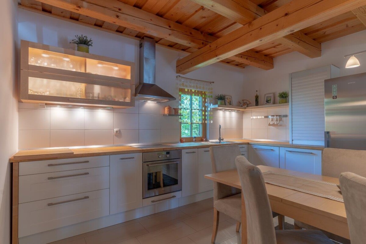 Gaudeix de la relaxació definitiva en aquest encantador refugi de fusta situat al camp tranquil d'Eslovènia. La vil·la, feta de fusta massissa amb un mobiliari exquisit, desprèn l'elegància natural. Gaudeix de la calidesa de la teva llar de foc privada, relaxa't a la gran sauna panoràmica a l'aire lliure i gaudeix de la banyera d'hidromassatge a l'aire lliure, tot aïllat. La teva escapada de somni combina el luxe, la tranquil·litat i el romanticisme. Descobreix les delícies locals i embarca't en aventures. Deixa que aquest encantador refugi reinicii el teu vincle.