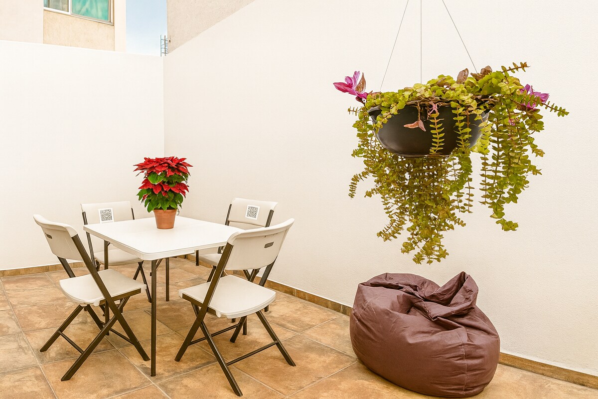 Bonica caseta amb una ubicació fantàstica, a 5 minuts de l'Udlap i a 10 minuts de centres comercials com Angelópolis o Explanada. La casa està totalment equipada, tindràs 2 dormitoris, 1 bany complet, una cuina acollidora, sala de televisió a més d'un pati de servei i un garatge. Pots visitar restaurants, bars i la zona turística molt a prop de la zona. El complex té zones verdes i un parc infantil per als més petits de la família.