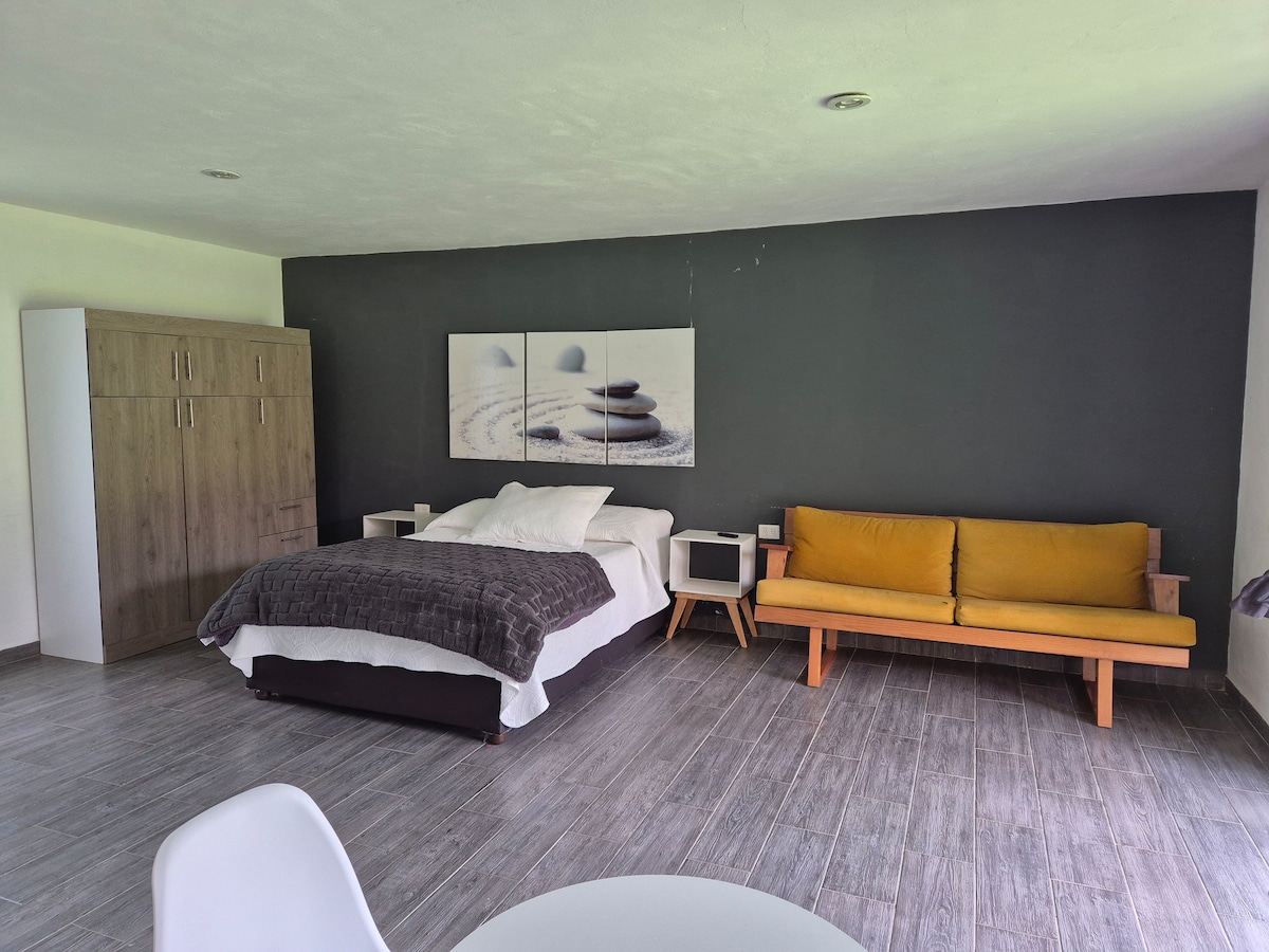 Disfruta de una acogedora cabaña con el encanto perfecto entre lo natural y lo urbano 🌿. ✨️Ubicada a solo una cuadra de la hermosa Laguna de San Baltazar y a una cuadra del tradicional Mercado Zapata, este espacio te ofrece lo mejor de ambos mundos: naturaleza, sabor local y comodidad. 🚶♀️ Todo está cerca: parques, transporte, comida centros comerciales 💖 Perfecta para parejas que buscan un refugio tranquilo y céntrico. ✨ Tu escapada romántica en Puebla te espera. Ven a vivirla