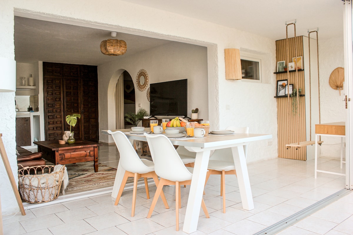Apartament reformat i elegant amb vistes a l'oceà. Acollidor i romàntic. Equipat amb totes les comoditats; Equip de música amb USB i Bluetooth, televisor de 43", NETFLIX, Disney+ i satèl·lit. Terrassa privada amb un bonic porxo perfecte per gaudir d'una nit a la llum de les veles, i també un petit i acollidor jardí també privat. Piscina comunitària a només 10 passos, amb boniques vistes de l'oceà i del Puerto de la Cruz. GARANTIM LA NETEJA, EL SANEJAMENT I EL CONFORT.