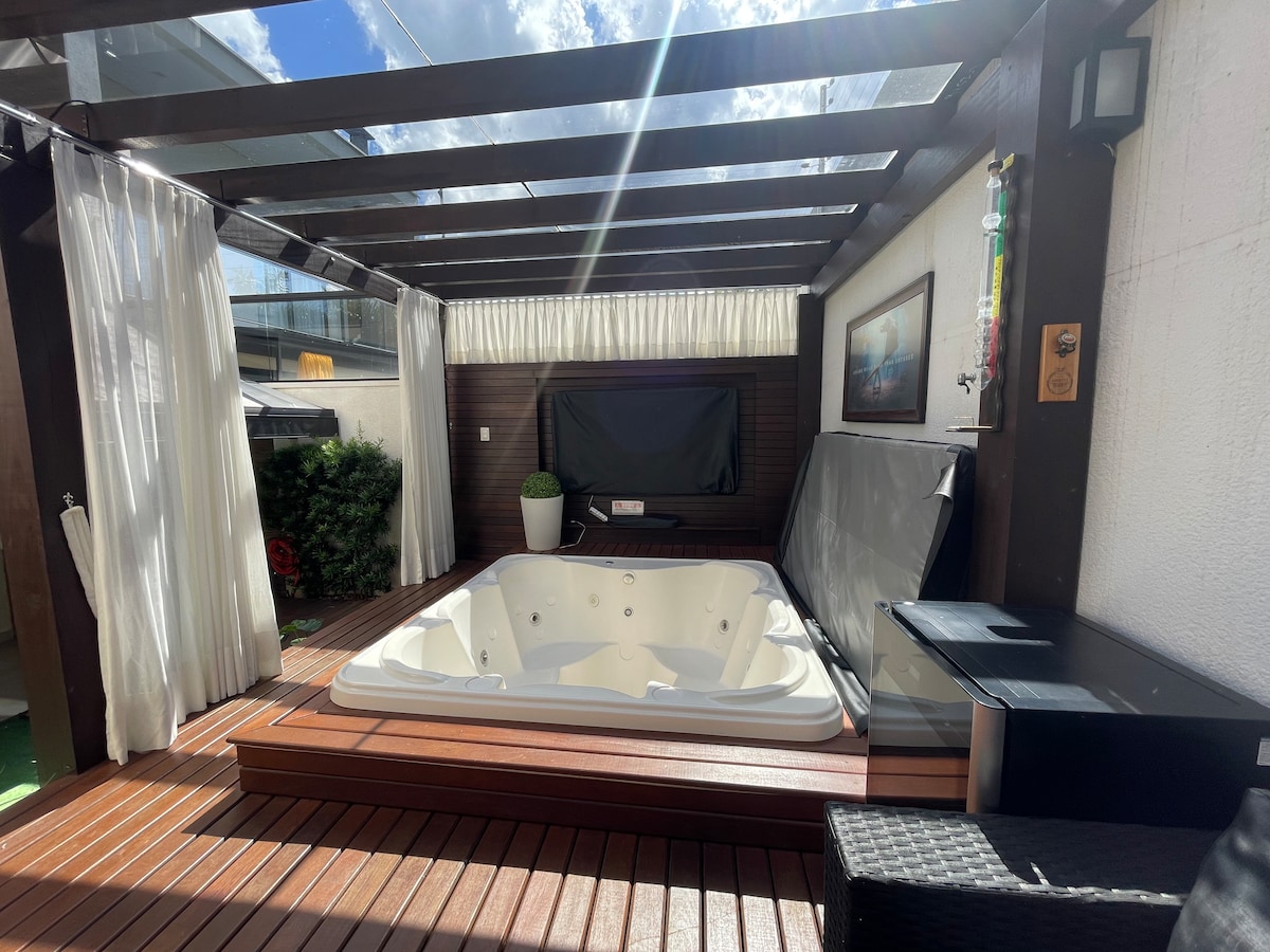 Na parte superior da casa encontrasse os quartos, sendo uma suite + 2 quartos e banheiro. Todos os cômodos com ar condicionado e sacada. Na parte de baixo fica a garagem que abriga 2 carros + sala de tv com internet e lavabo. Cozinha com utensilios domésticos, geladeira, microondas, fogão, forno elétrico. Área gourmet com ar condicionado + churrasqueiras com espetos + utensilios. Parte externa com SPA Jacuzzi, banheiro completo.