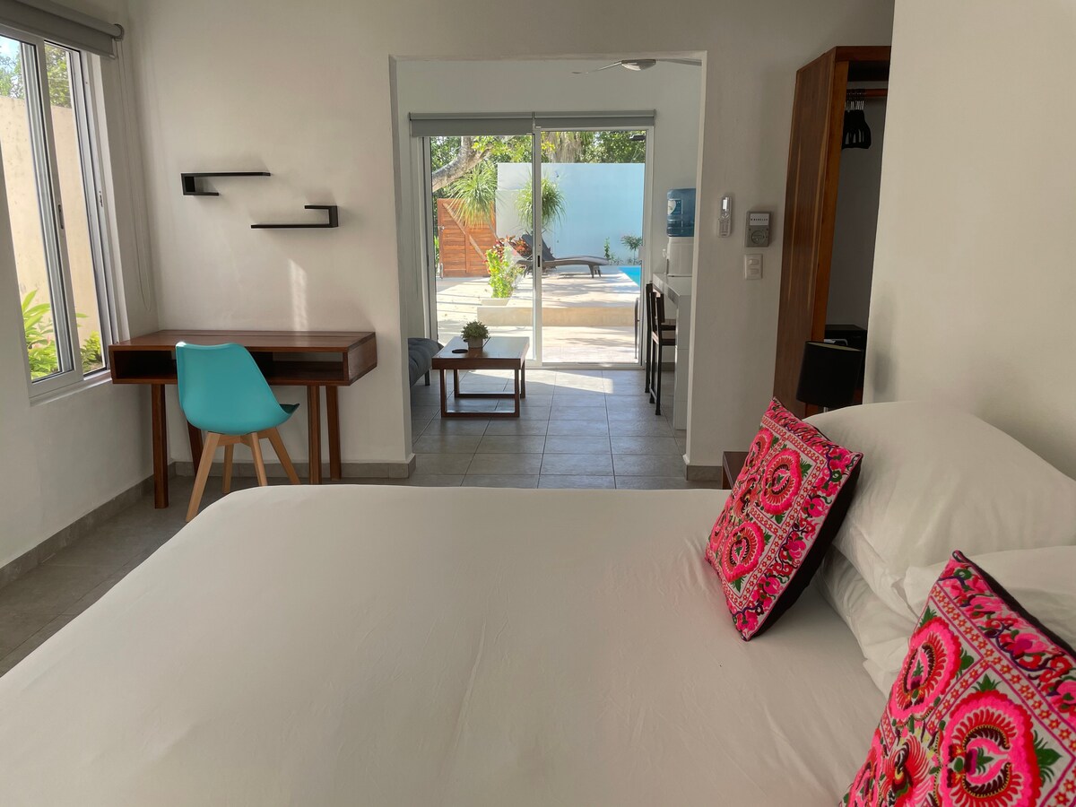 Vine i gaudeix de la teva estada al nostre apartament lluminós i fresc d'un dormitori amb piscina per a les teves vacances a Puerto Morelos. Cadascun dels nostres 8 apartaments té un llit king size molt còmode, cuina totalment equipada, sala d'estar, escriptori, televisor intel·ligent, aire condicionat i WIFI. Estem ubicats a 100 metres de l'entrada de la platja i estem a 2,5 km/1,5 milles al nord del centre de la ciutat. Si no veus la disponibilitat. Si estàs interessat en reservar diversos apartaments o tota la propietat, envia'ns un missatge.