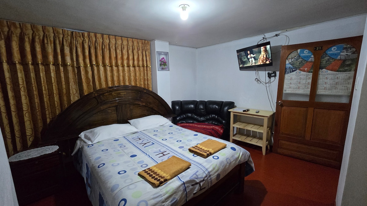Si viatges amb un amic i necessiteu compartir una habitació però cadascú en el seu propi llit, i també busqueu espais amplis, lluny del soroll i amb una vista espectacular de la ciutat, amb esmorzar inclòs i garatge, llavors aquest és el teu espai ideal, a 6 minuts en taxi del centre de la Plaça d'Armes de Puno. Sent-te com a casa i coneix gent que viatja.
