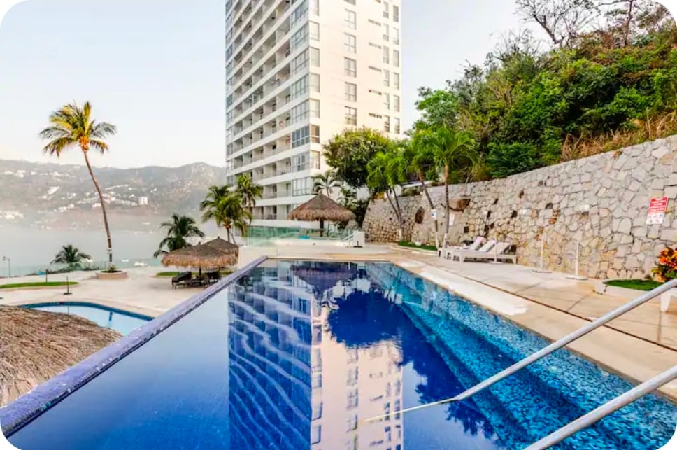** TARIFES REDUÏDES PER A GRUPS PETITS. Consulta-ho.** Es tracta d'un apartament elegant i de bon gust a primera línia de platja a Real Diamante amb accés directe a la platja i una gran terrassa privada. Pis de luxe en un edifici de poca alçada amb accés directe a la platja de sorra blanca. Amplia terrassa amb vistes panoràmiques al mar i piscina d'immersió. Situat a la regió de Diamante d'Acapulco - Segur, bonic, luxós - 3 piscines infinites.