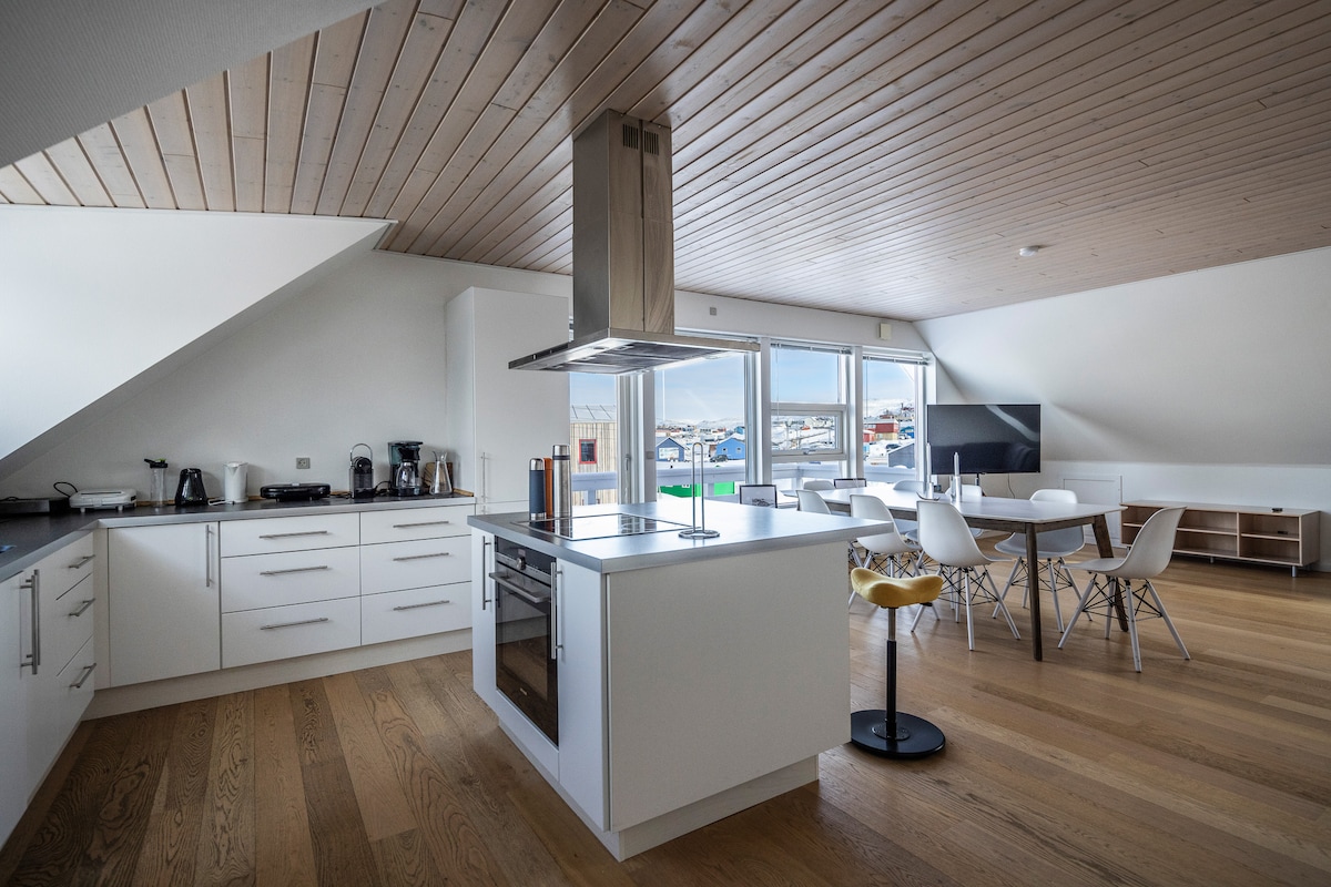 La casa té vistes a la badia de la discoteca i és a prop del centre de la ciutat. Disposa d'una terrassa on es pot seure a l'aire lliure i gaudir de les vistes. Si tens sort, pots veure balenes des de casa a l'estiu. És una casa acollidora amb sala d'estar, cuina, 2 lavabos, 1 bany, dona lliure, tovalloles, roba de llit. 3 dormitoris, un gran amb llit i 2 petits amb 2 llits cadascun.