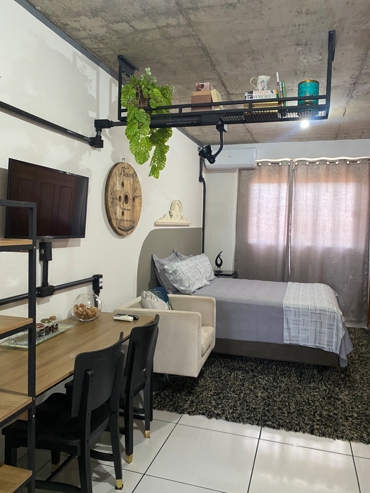 Este lugar único tem um estilo próprio. A trabalho ou a passeio, aqui você encontra a acomodação ideal para ficar. Esse apartamento estilo Studio é funcional e tem todo o conforto que você precisa. Apartamento com ar condicionado. Esse apartamento fica no segundo andar, acesso por escadas. Obs: Estacionamento ao ar livre.