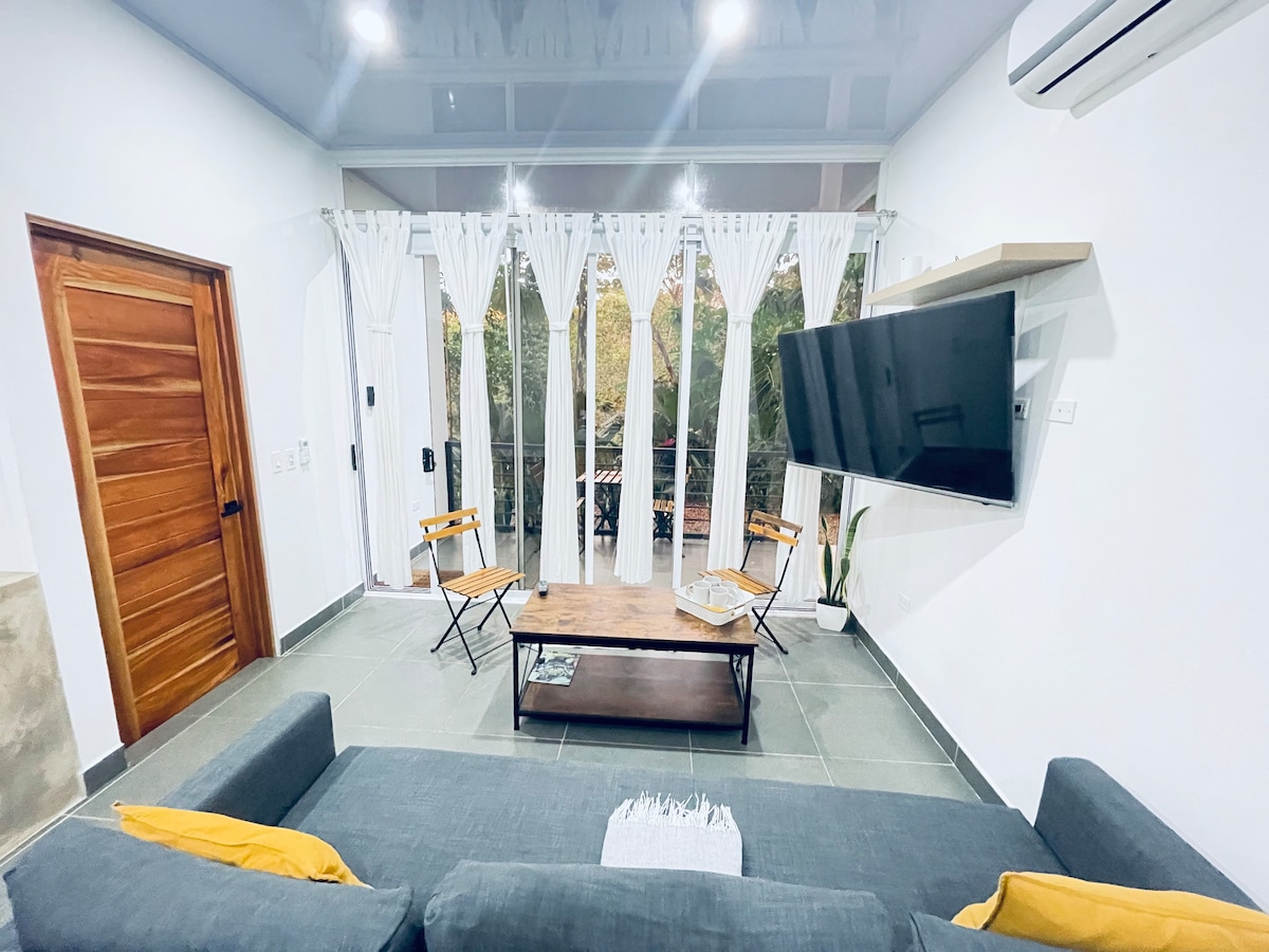 El nostre elegant pis estudi es troba al cor de Dominical! Amb una cuina completa, un llit queen, un sofà llit i un sostre inferior únic a la cuina, és un lloc perfecte per a una parella, un viatger solitari o una família petita per gaudir del que ofereix Dominical. Està a 5 minuts a peu de la platja i és un lloc segur i còmode per passar les vacances! Vine a fer surf a les onades d'alt rendiment de Dominical, gaudeix de les nostres boniques platges, gaudeix de les moltes activitats d'aventura que oferim o relaxa't!