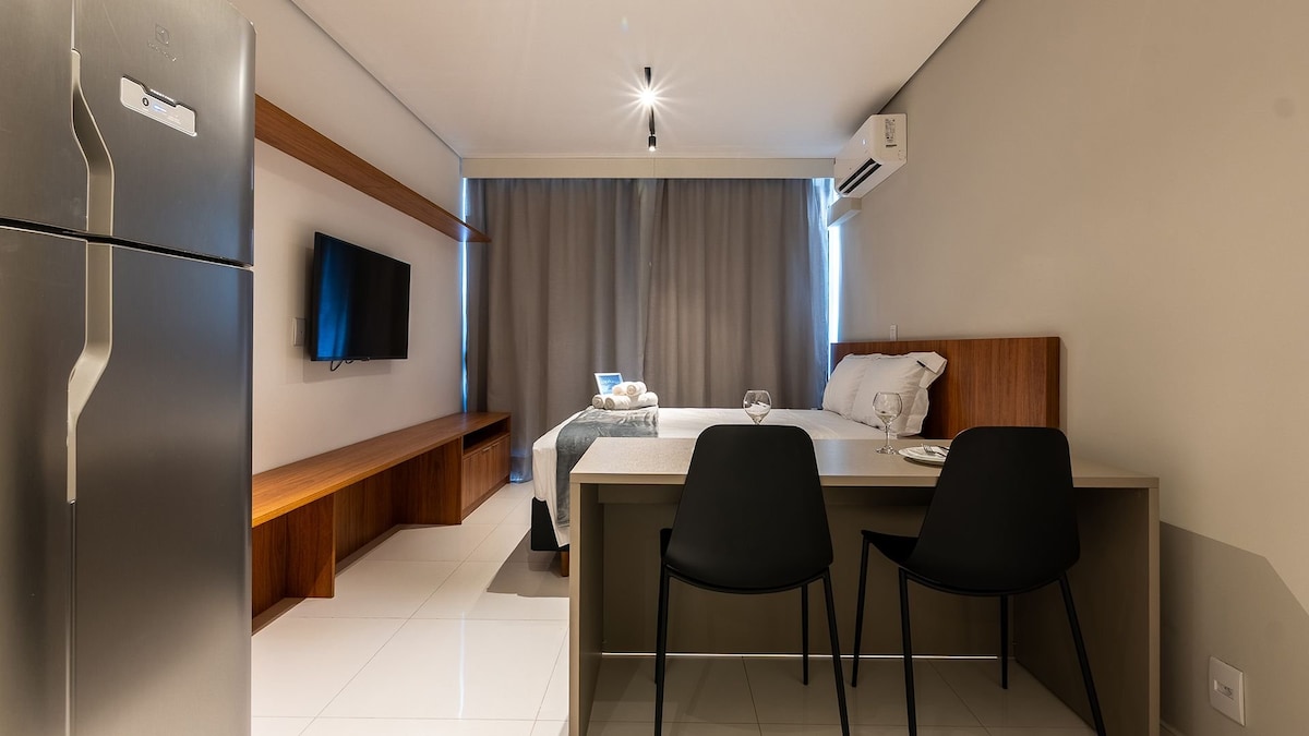 Estudi modern i acollidor de 24 m², a menys de 5 minuts del metro Tatuapé i de la zona comercial. Equipat amb aire condicionat, wifi, cuina petita (fregidora d'aire, microones, nevera, bullidor elèctric), equipament inclòs (sabó, xampú, assecador de cabells), roba de llit i tovalloles. Pis amb bugaderia, espai de cotreball, gimnàs, piscina i espai gourmet. Edifici amb seguretat les 24 hores Ideal per a l'oci o la feina!