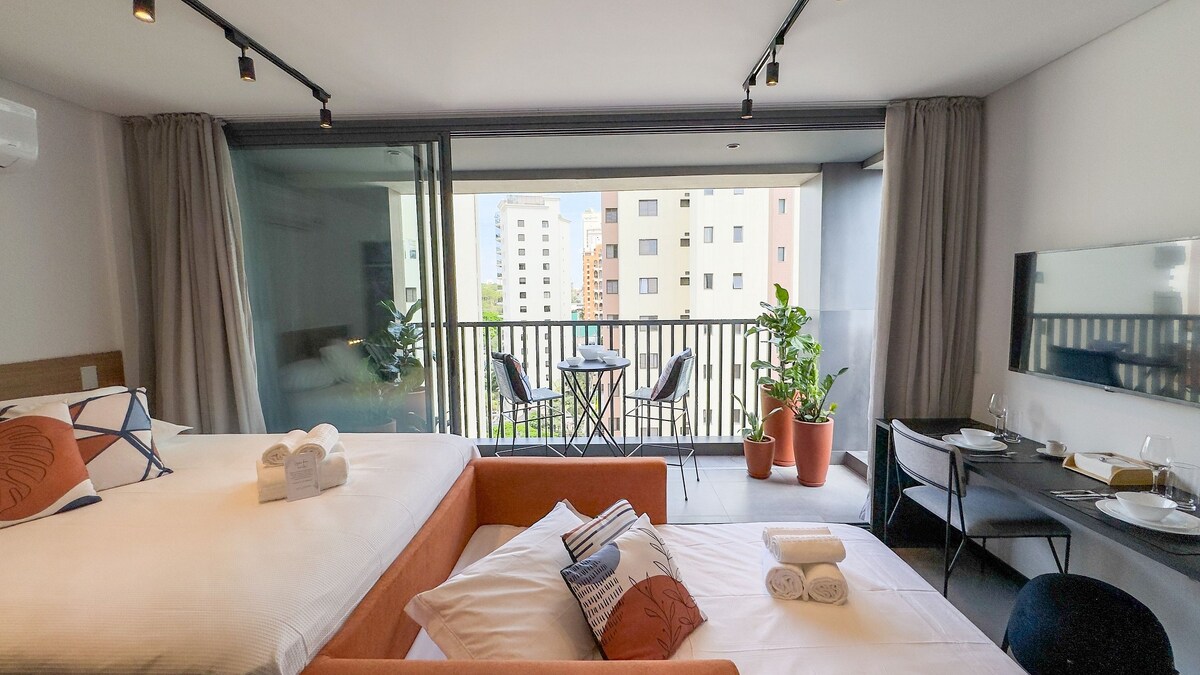 Estúdio espaçoso com muito design, arquitetura e a melhor vista de São Paulo. Loft completo! Com cama queen, closet, ar condicionado silencioso, cozinha completa, home office, WI-FI, TV 55” e uma belíssima banheira de imersão, de onde pode apreciar o seu drink preferido e curtir uma vista apaixonante. São Paulo toda estará há poucos minutos de você. Acesse o metrô andando apenas 200m. Reserve com tranquilidade! Proporcionaremos uma excelente hospedagem e uma ótima experiência!