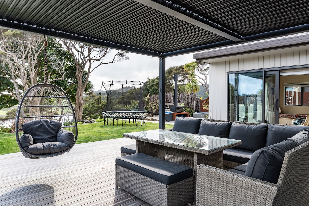 Casa de quatre dormitoris molt espaiosa i privada de quatre dormitoris i dos banys situada en un arbustó natiu impecable. Situat al turó de Te Akau amb vistes al port de Raglan, amb les millors vistes del municipi de Raglan. Amplies zones d'estar a l'aire lliure amb unes grans terrasses assolellades i zones ajardinades amb banyera d'hidromassatge, barbacoa i forn de pizza a l'aire lliure. Les terrasses creen una àmplia sala d'estar que agafen el sol tot el dia. H&C fora de la dutxa. Platja privada per nedar i esquiar aquàtic.