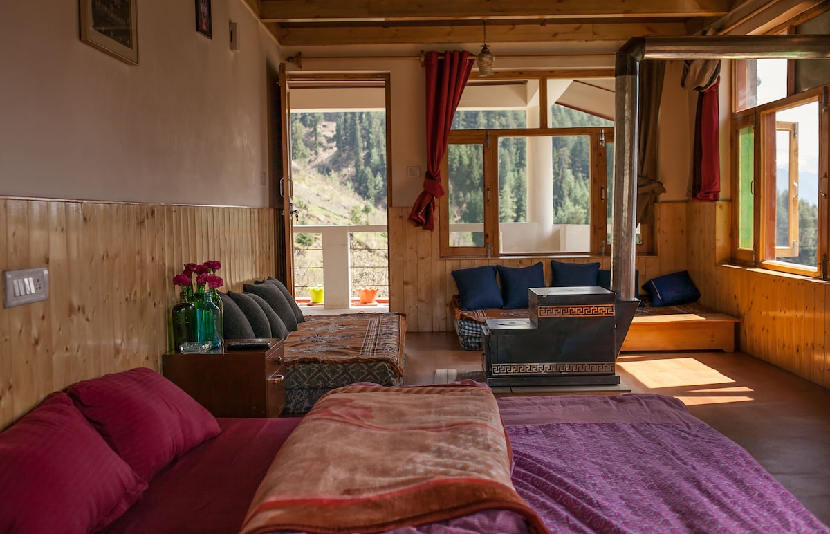 Aquesta és la nostra antiga casa familiar, construïda amb l'arquitectura tradicional de Kulvi. Es troba en una zona poc poblada del poble, lluny del soroll i l'enrenou. Envoltada de pomes, prunes i caquis, amb vistes al riu Beas, només se sent el rugit del riu i el cant dels ocells. És una escapada perfecta per a algú que busca una estada tranquil·la. Els hostes tenen a la seva disposició tres habitacions, una cuina funcional i un bany. T'encantarà l'ambient pintoresc i rústic del lloc.