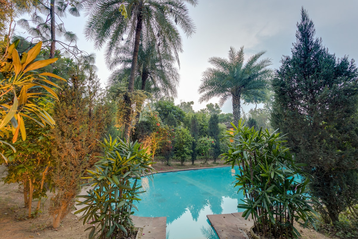 Una casa rural d'estil britànic al camp amb roses precioses, gespa exuberant i una piscina romàntica per a una escapada feliç de la ciutat. A una hora en cotxe de Gurgaon, la casa rural està situada en una bonica filera de cases de camp, a prop de camps de mostassa i un terreny de criquet. Molt a prop del Heritage Transport Museum (5,3 km) i del NeverEnuf Rail Garden (3 km). L'entorn perfecte per passar un cap de setmana.