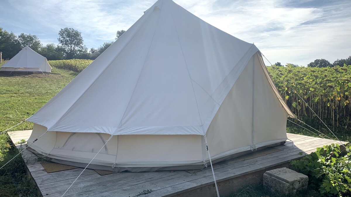 Tenda 2 adults i 3 nens, totes les comoditats 5 m. NO ES PROPORCIONEN LLENÇOLS o 15 € per estada. No s'admeten animals de companyia (ni a l'interior ni a l'exterior). Passa una nit inusual en una tenda còmoda! En un entorn encantador i romàntic, a prop de botigues del poble. Cuina petita: microones, cafetera, nevera, gas. Bany exterior: vàter sec, dutxa, pica. Tenim una altra tenda: https://www.airbnb.fr/rooms/1138147177441261838
