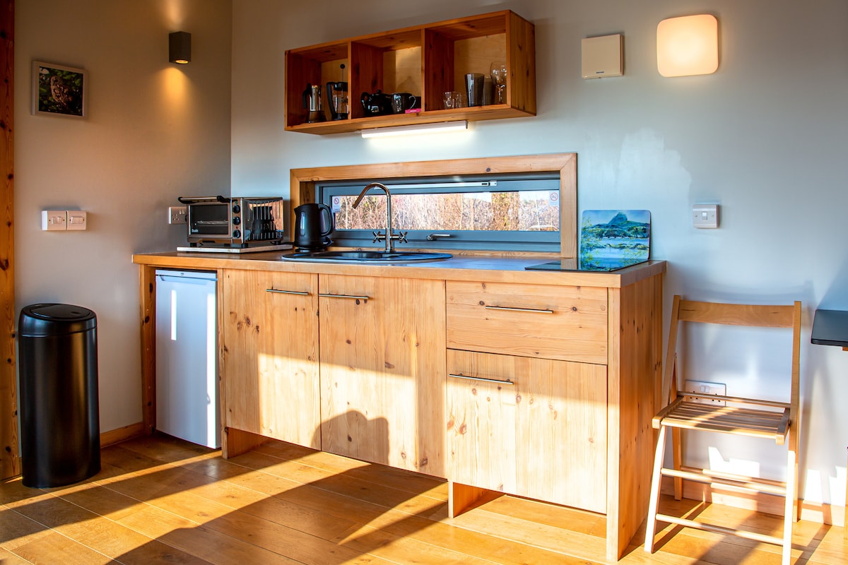 The Hide és una escapada fantàstica per a qualsevol persona que viatgi per Escòcia per la NC500 o en la teva pròpia aventura que busqui un allotjament únic. Gairebé fora de la xarxa, té un llit còmode, una estufa de llenya central i una vista espectacular. És el pas perfecte cap a l'experiència completa fora de la xarxa, pensada per a les persones que tenen curiositat per viure l'estil de vida fora de la xarxa, però que també els agrada poder carregar el telèfon, bullir una bullidora i tenir una dutxa calenta. De mitjans de novembre a març, l'allotjament entra en mode hivern, ja que l'aigua es pot congelar.